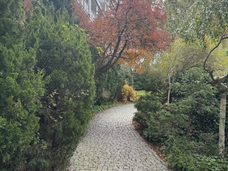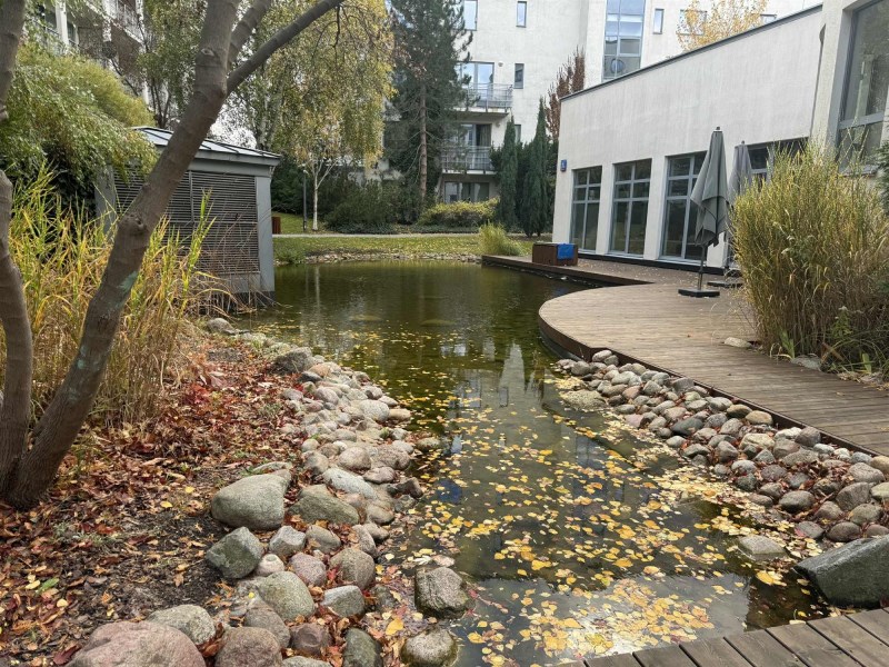 Okna (na południe) wychodzą na przestronne patio z oczkiem wodnym, ławeczkami, piękną zadbaną zielenią i małym placem zabaw dla dzieci.