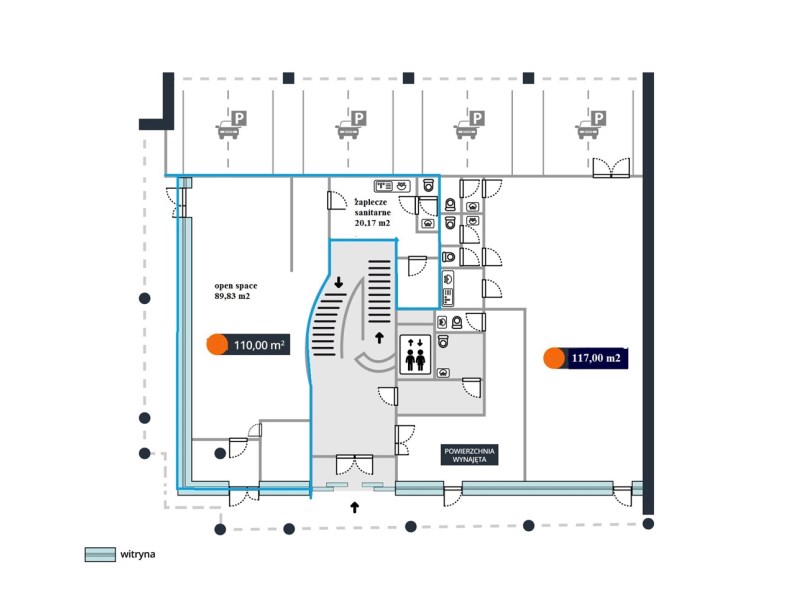 * Wolny lokal użytkowy to 110m2 na parterze z dużą witryną i osobnym wejściem z ulicy i drugim z lobby budynku. Duża sala sprzedażowa 90m2 i 20m2 zaplecze socjalne, na podłodze terakota, podwieszane sufity, otwierane okna, klimatyzacja, sieć strukturalna teleinformatyczna. Ochrona 24h.