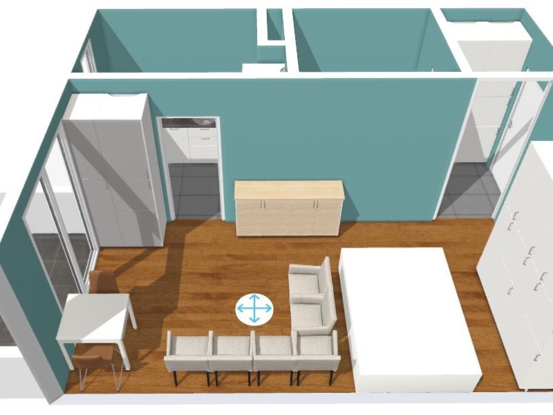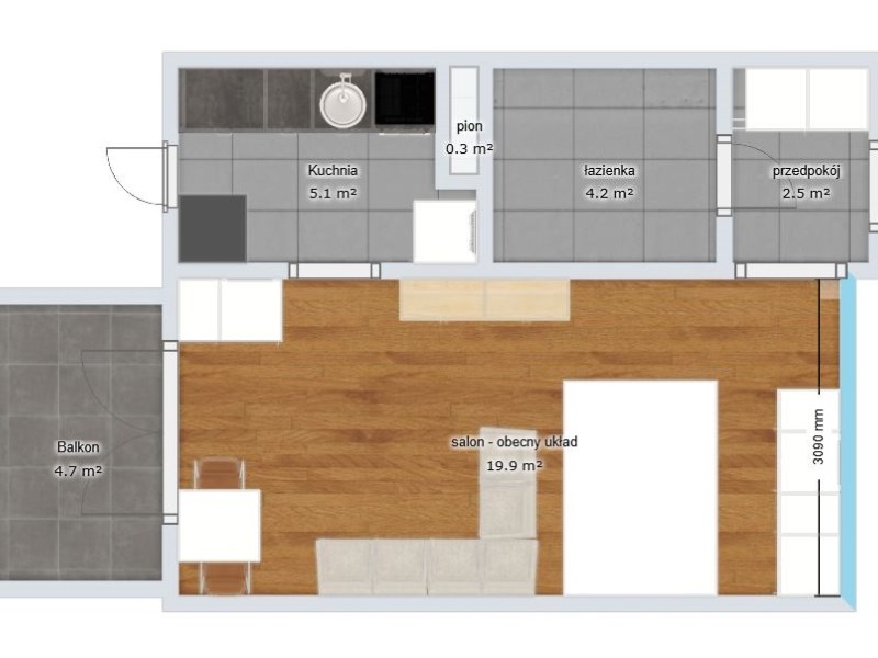 Składa się z pokoju dziennego 20 m2, kuchni 5 m2, łazienki 4 m2, oraz przedpokoju 2,6 m2 .