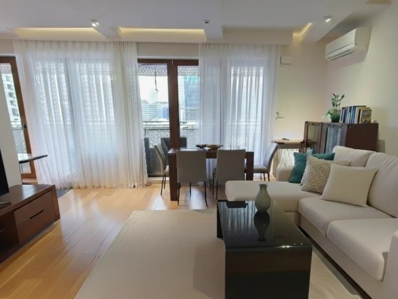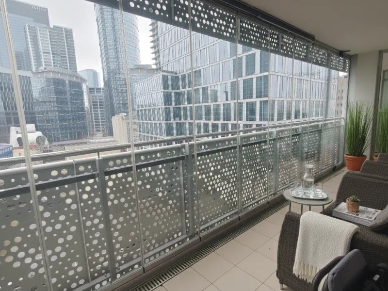 Ekspozycja na dwie strony świata: część dzienna z dużą loggią od południowego-wchodu, z ciekawym widokiem m.in. na wieżowce prężnie rozwijającej się okolicy Ronda Daszyńskiego; obie sypialnie od północnego-zachodu, (ciche, zielone patio).