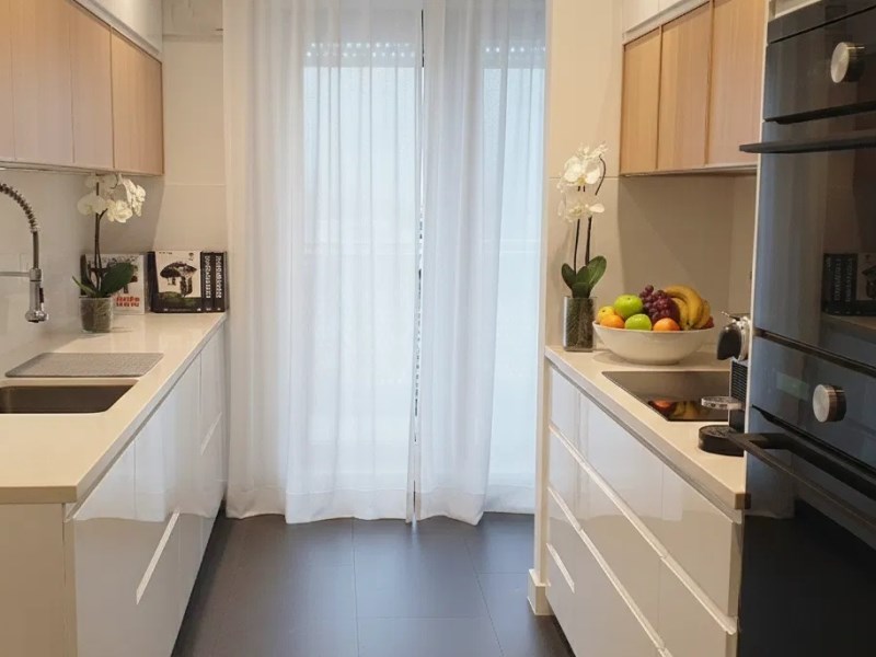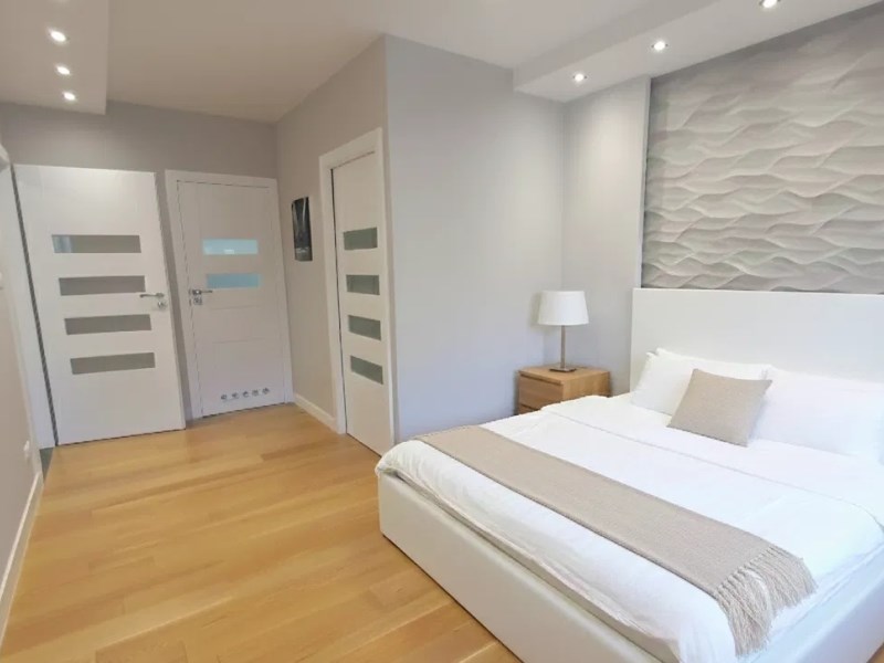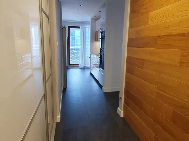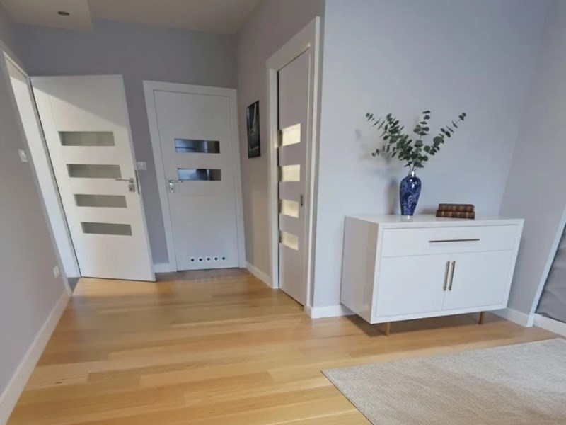 W pokojach na podłodze deska drewniana, w pozostałych pomieszczeniach gres. Wysokie listwy, spójna paleta kolorystyczna, armatura i ceramika marek premium.