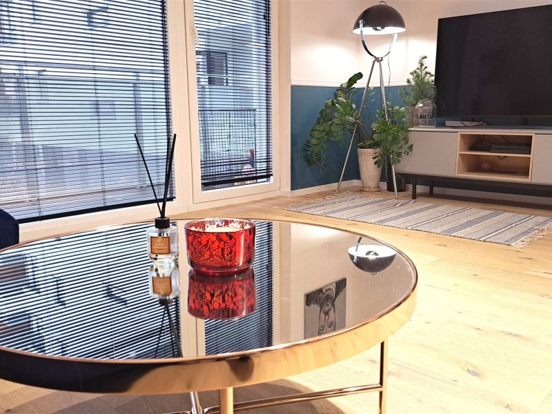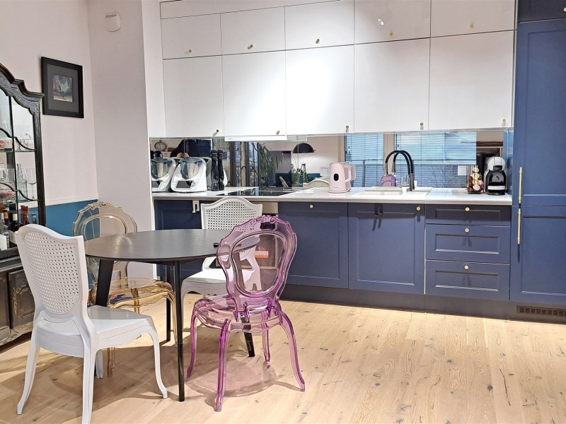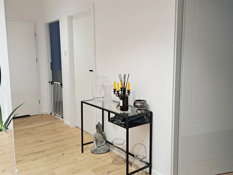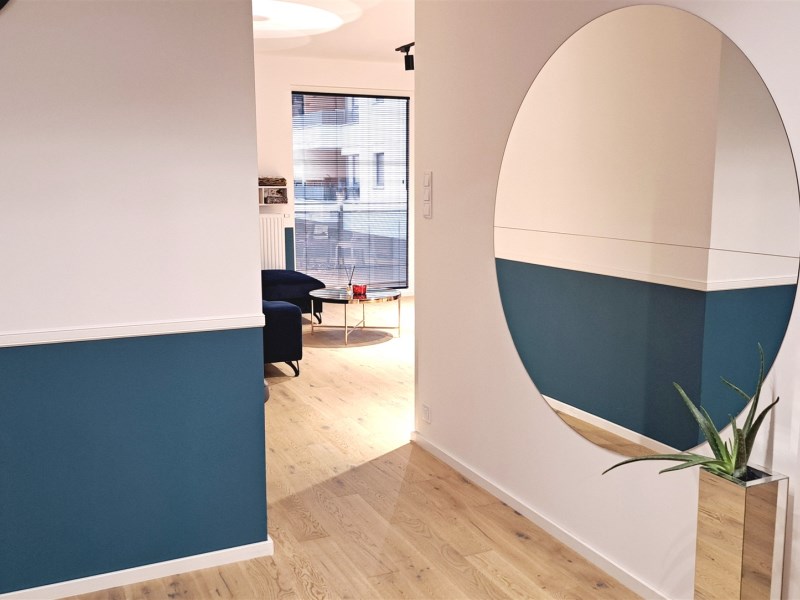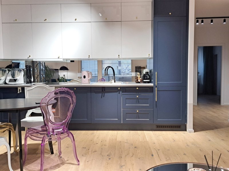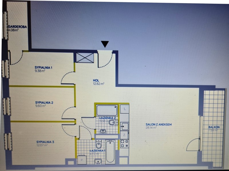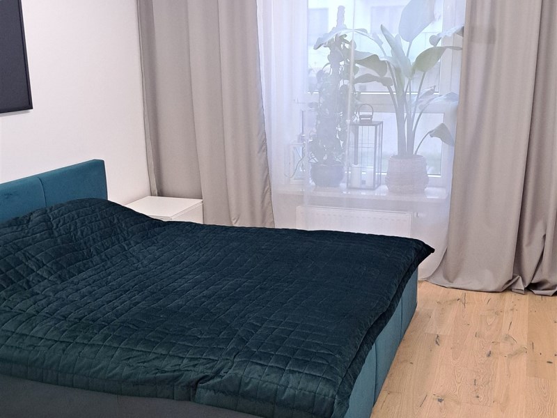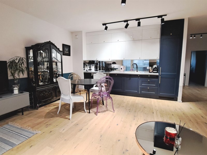 Salon z aneksem kuchennym, 3 sypialnie (jedna z przynależną garderobą), 2 pełne łazienki (jedna z wanna wolnostojącą, druga z prysznicem i pralką) i balkon 8 m.2