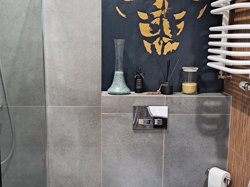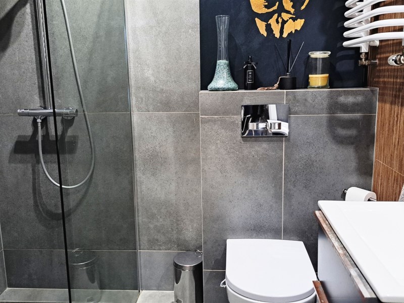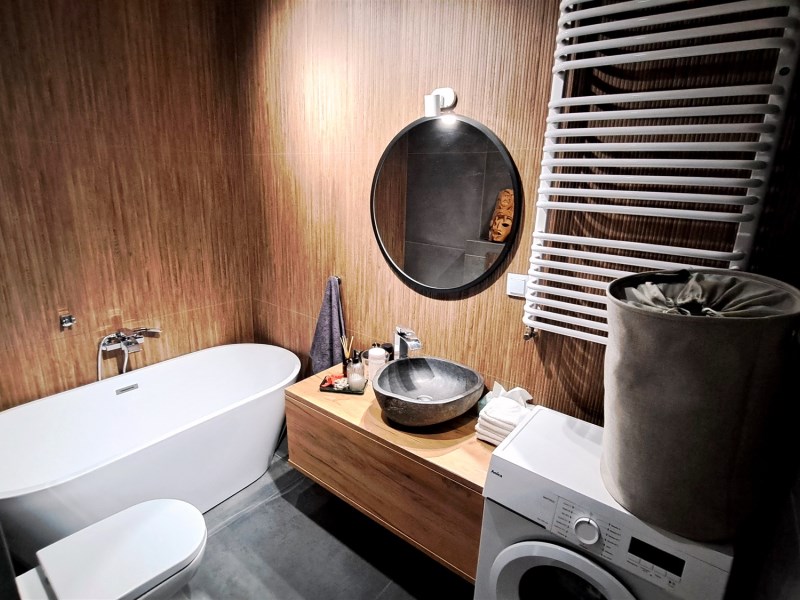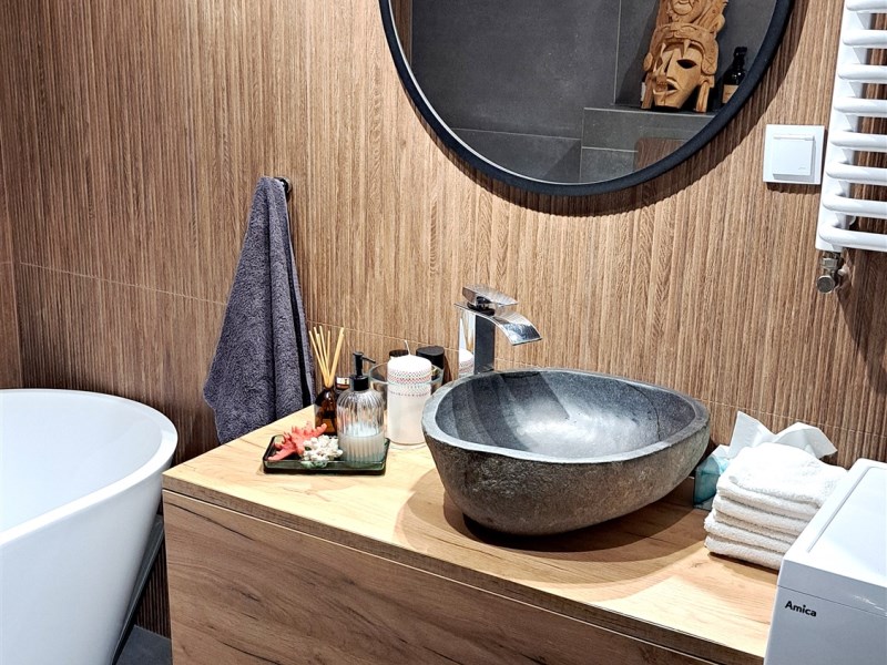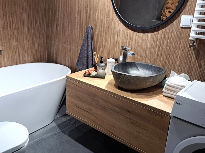 Wysokiej klasy armatura i glazura, drewniana podłoga z dębu bielonego.