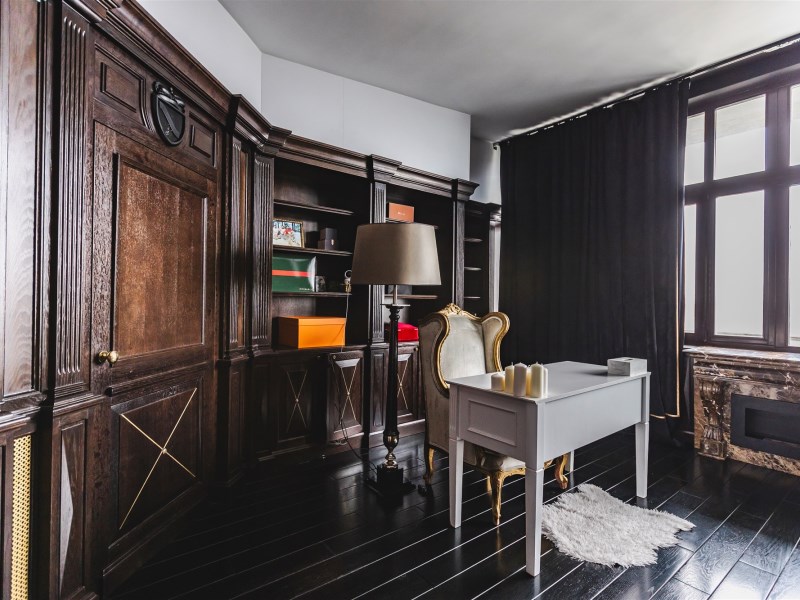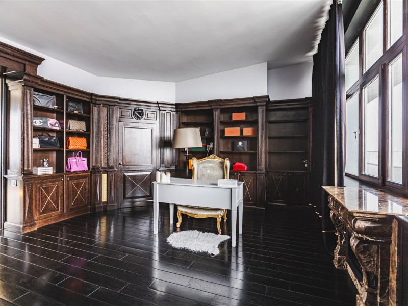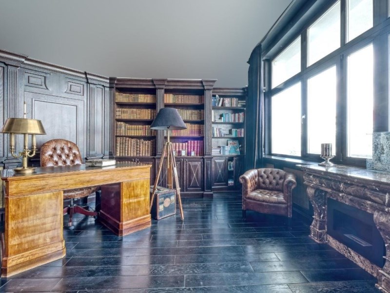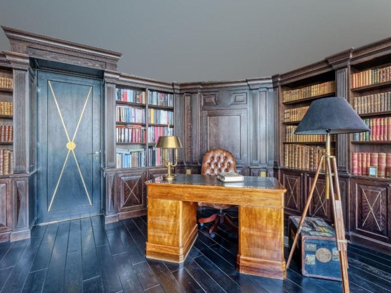 5. Gabinet z kominkiem marmurowym i zabudowany dębową biblioteką wykonaną na zamówienie z wyjściem na kolejny taras.