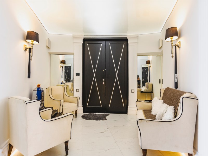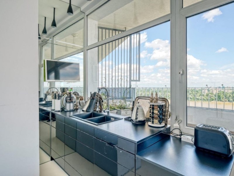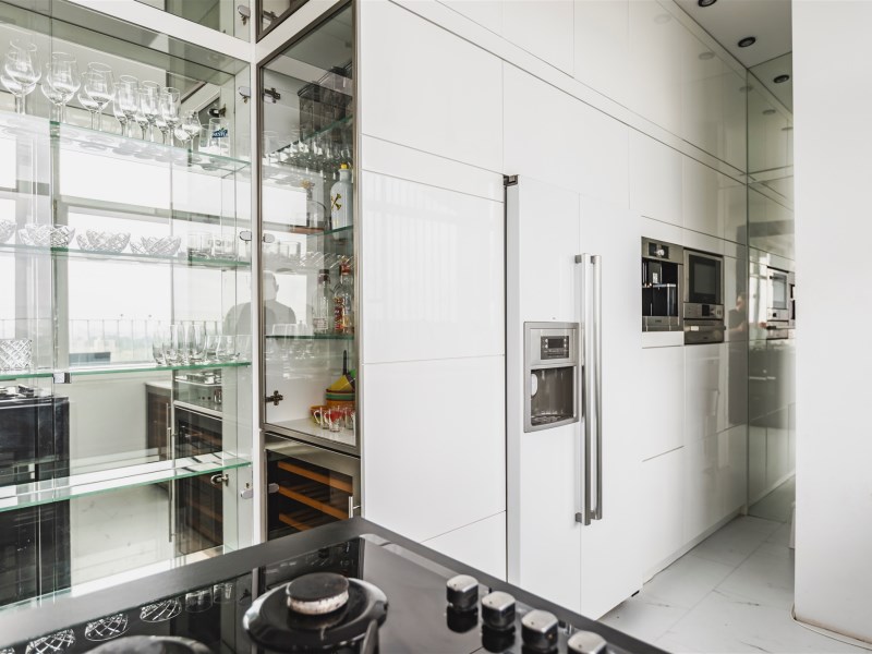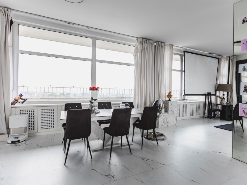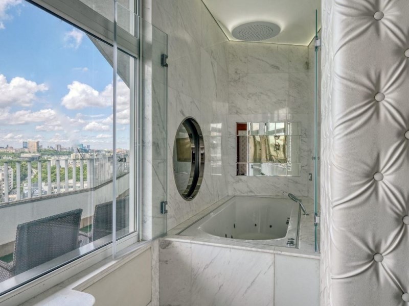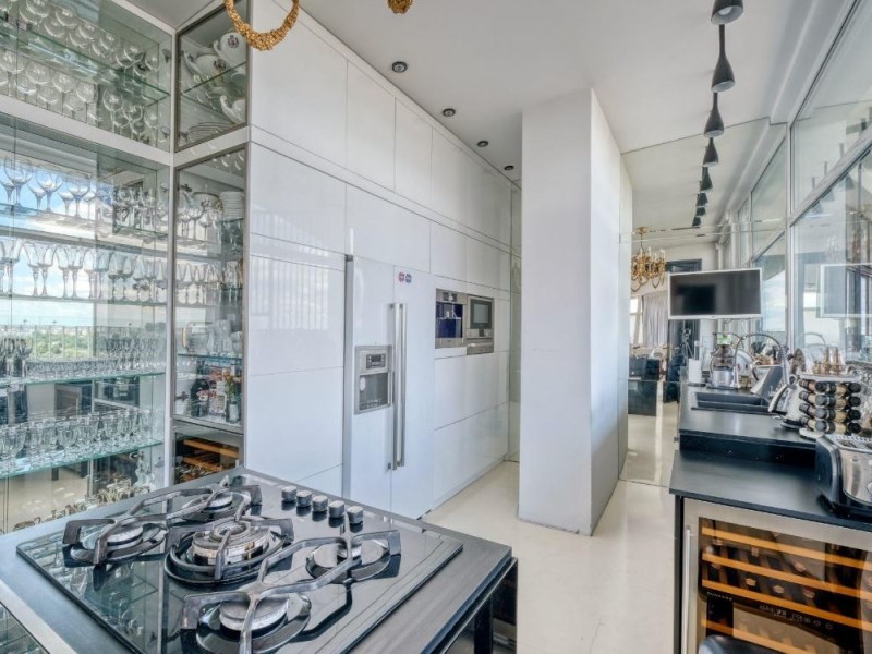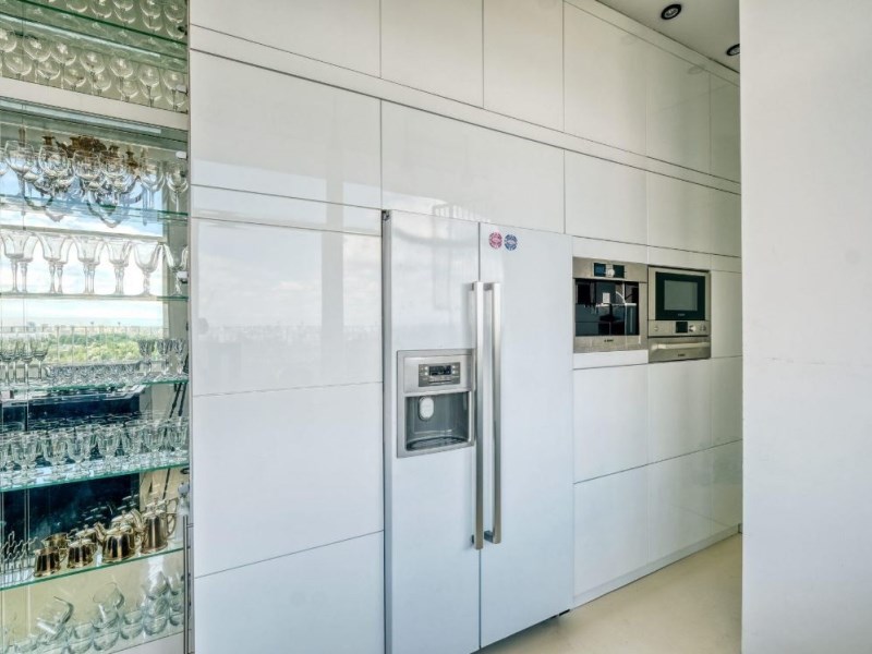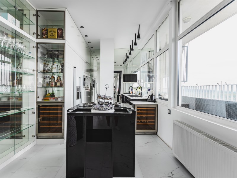 Penthouse wyróżnia się bardzo gustownym, jasnym wnętrzem, zaprojektowanym przy użyciu najlepszej jakości materiałów: marmur, drewno dębowe i egzotyczne, mosiądz oraz sprzętu: marki BOSCH, Samsung oraz Apple.