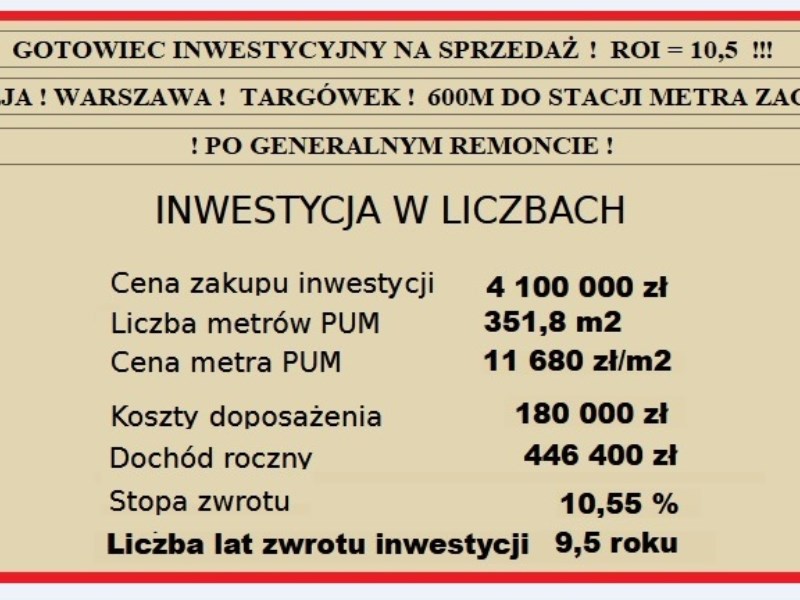 Jest to absolutna okazja - tzw GOTOWIEC INWESTYCYJNY, dla którego ROI=10,5 (!!!).